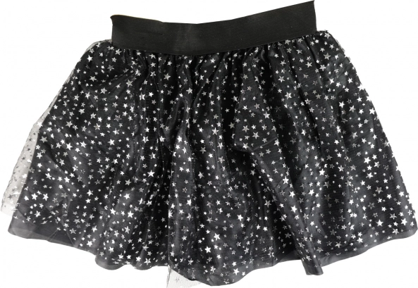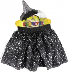 Geweldige set voor alle kleine dametjes-heksjes! Het rokje heeft een zwarte onderrok, bedekt met tule met een print van zilveren sterretjes. Geschikt voor meisjes van 3–7 jaar. De rok is 28 cm lang. De set wordt aangevuld met een haarband met een hoedje dat perfect bij het rokje past. Ook ideaal voor een Halloweenfeest of carnaval!
