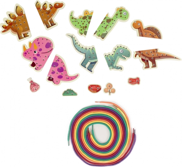 In de verpakking vind je vijf gekleurde dinosaurusdelen en vijf stevige, kleurrijke veters voor eindeloze rijgcombinaties.