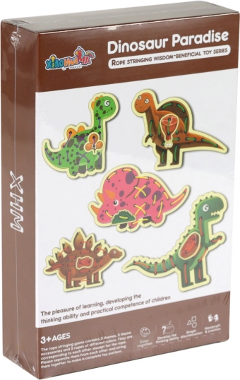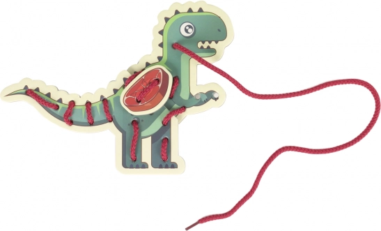 De patroonopeningen in de houten dinosaurussen stimuleren vingerprecisie, concentratie en oog-handcoördinatie bij elke rijgbeweging.