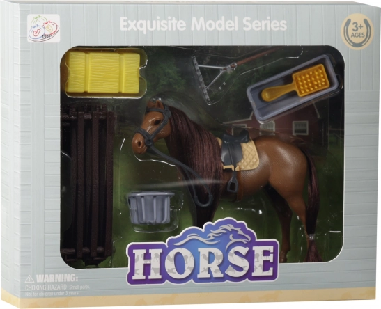 Een schattig bruin paard met donker gekleurde manen en een zadel zal kleine dierenliefhebbers verrassen. In de verpakking vind je ook een opvouwbare omheining en verzorgingsaccessoires, inclusief een borstel. De grootte van het paard is 14 cm en het materiaal is van hoogwaardige PVC. Geniet van realistisch boerderijspel en paardenverzorging met rijk accessoirepakket.