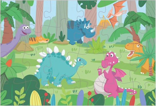 Ontdek een leuke kinderpuzzel met vrolijke dinosaurussen. De set bevat 24 grote stukjes die gemakkelijk vast te pakken zijn voor kleine handjes. De voltooide afbeelding meet 50 × 34 cm en stimuleert op speelse wijze logisch denken, fijne motoriek en creativiteit bij kinderen.
