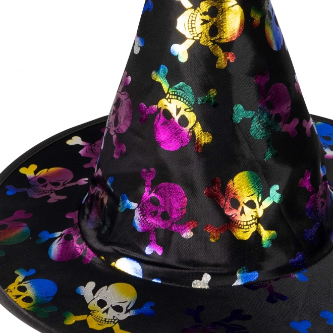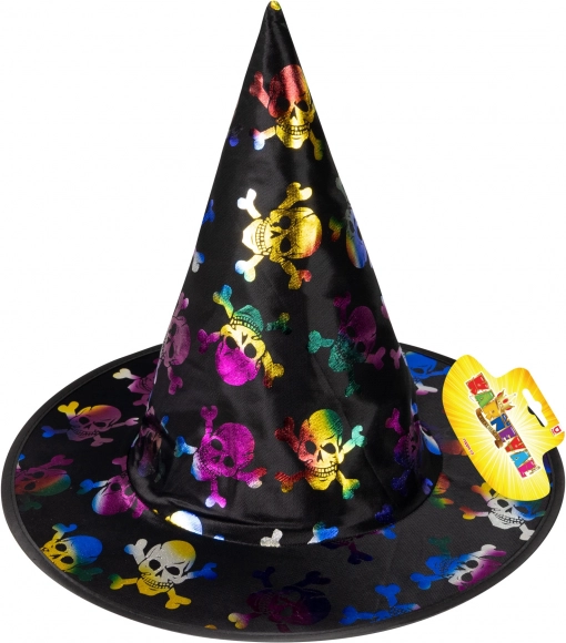 Creëer een onvergetelijk kostuum met deze zwarte hoed met kleurrijke schedelprint. Ideaal voor heksen- en Halloweenoutfits en eenvoudig te combineren met een cape, jurk of masker. Dankzij de kindermaat zit hij uitstekend en maakt hij elke griezelige of sprookjesachtige transformatie compleet.
