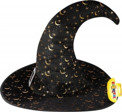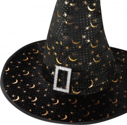 Stel de perfecte heksen- of tovenaarsoutfit samen met deze elegante hoed in klassiek zwart. De brede rand en spitse vorm zorgen voor een authentieke look, terwijl de gouden sterren en halve manen prachtig schitteren en de mystieke sfeer benadrukken. De decoratieve gesp aan de basis van de kegel geeft het geheel extra flair.