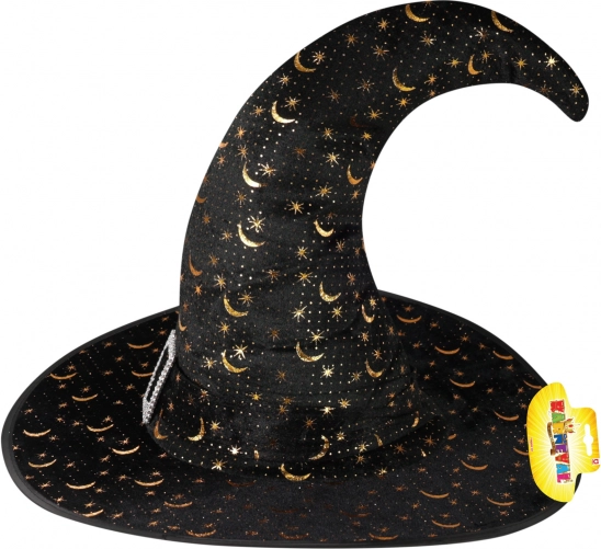 Stijlvolle zwarte toverhoed voor volwassenen met gouden print van sterren en manen en een decoratieve zilveren gesp. Ideaal voor Halloween, carnaval, cosplay en themafeesten – zorgt voor een direct magische look en trekt de aandacht op elk evenement.