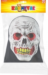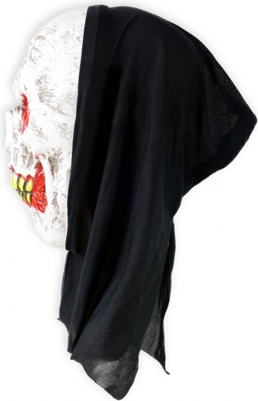Dit schedelmasker met zwarte doek/capuchon transformeert je kostuum in een oogwenk. Het contrasterende witte design met rode oogcontouren en gele tanden benadrukt de huiveringwekkende look, die zowel op foto’s als in het donker onder feestverlichting fantastisch uitkomt.