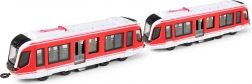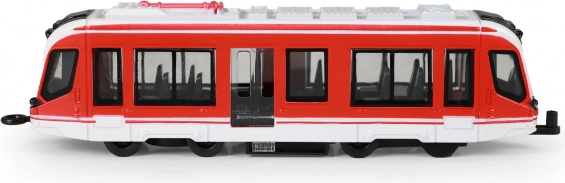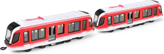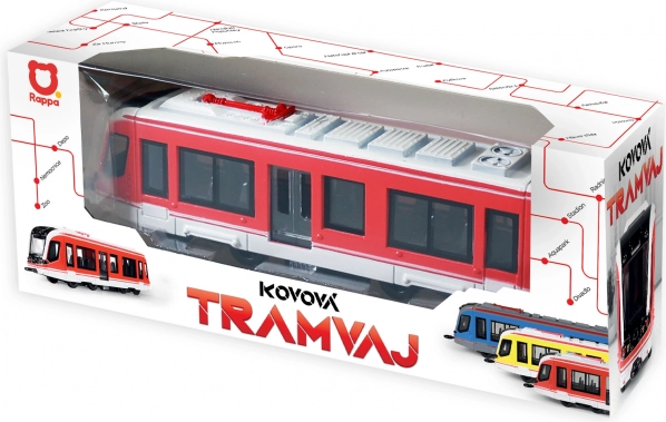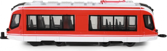 Realistische metalen tram in rood, lengte 20 cm, perfect voor kleine en grote liefhebbers van het openbaar vervoer. Biedt pull-back aandrijving voor dynamisch rijden, openende deuren bediend met een hendel en duurzame metalen constructie voor een lange levensduur. Een geweldig cadeau voor kinderen en verzamelaars.