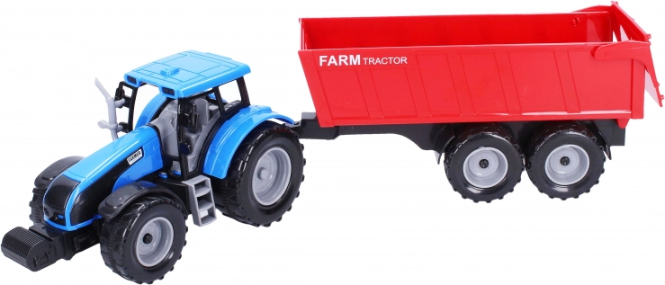 Tractor met aanhanger 42 cm en inertie-aandrijving. Twee varianten: blauw en rood. Ideaal voor kleine boeren.