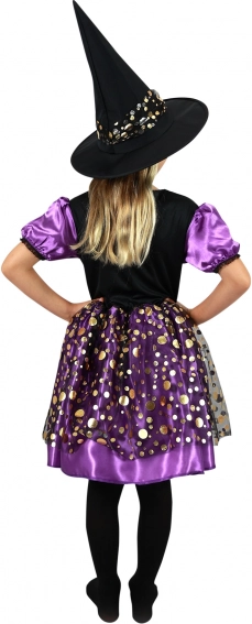 Een schattig en comfortabel kostuum voor kleine heksjes, perfect voor Halloween en carnaval. De jurk in een combinatie van paars en zwart met goudkleurige print en een bijpassende hoed zorgen voor... Meer tonen