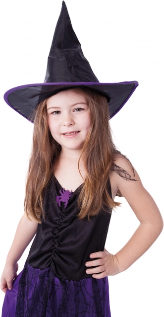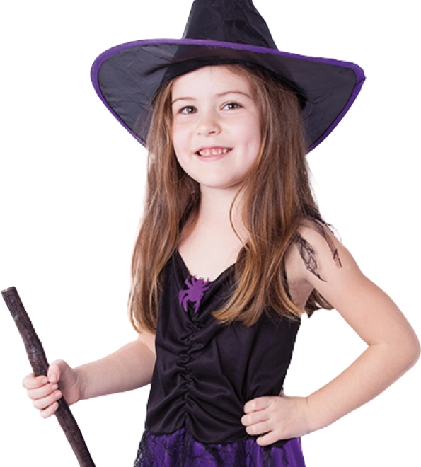 Het kinderheksenkostuum in een elegante zwart‑paarse combinatie is een perfecte keuze voor kleine liefhebsters van magie en fantasie. De lichtgewicht jurk is versierd met een spinnenwebpatroon en vormt samen met de hoed een mooi afgestemde outfit die op elk feestje opvalt.