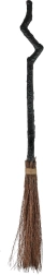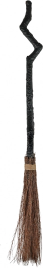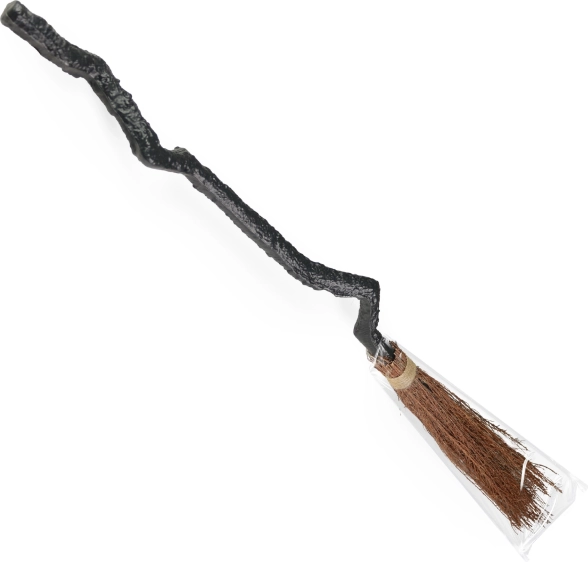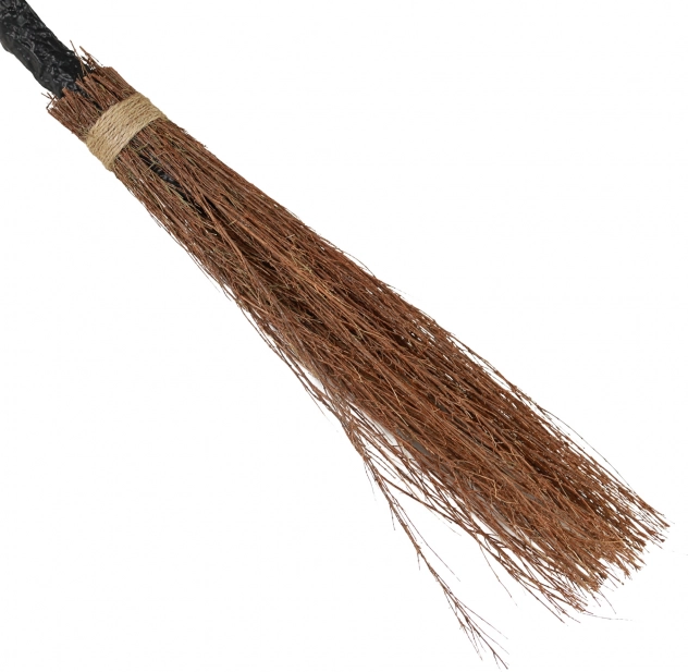 De bezem met zwarte handvat en bruine veegdeel doet denken aan een klassieke heksenrekwisiet.