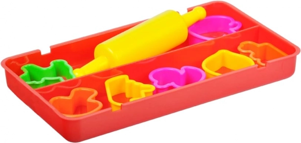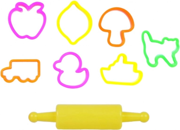 De set bevat kleurrijke kunststof vormpjes in verschillende vormen en een lichte gele deegroller, waarmee kinderen gemakkelijk uitrollen en perfecte motieven uitsteken.