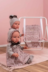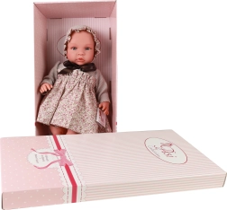 Martina heeft een zachte uitstraling zonder haartjes, opvallende niet-knipperende blauwe acrylogen en aangebrachte wimpers. De outfit bestaat uit een mooi jurkje met klittenbandsluiting op de rug, een strikmutsje en zachte slofjes – een ideale set voor dagelijks speelplezier of als cadeau. Het familiebedrijf ASI uit Spanje wijdt zich al meer dan 50 jaar aan eerlijke handgemaakte productie, met aandacht voor detail, kwaliteit en veiligheid.
