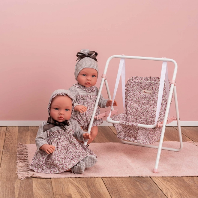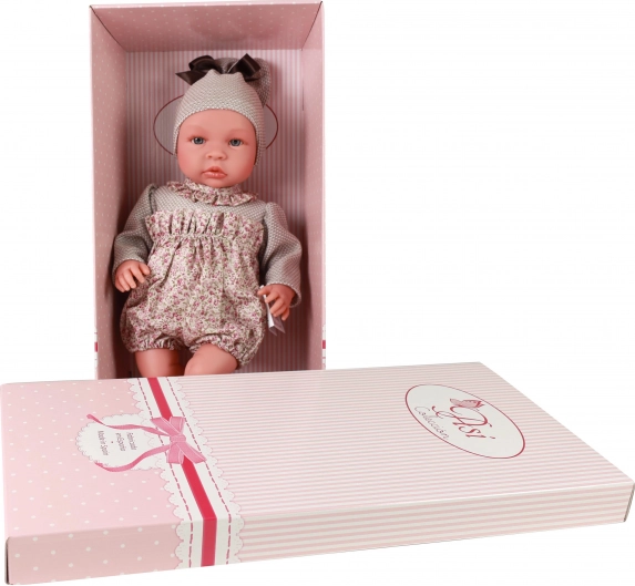 De pop is gekleed in een stijlvolle overall met klittenbandsluiting op de rug, aangevuld met een mutsje en slofjes in hetzelfde design. Hij heeft niet-knipperende blauwe acryloogjes en aangezette wimpers, zonder haartjes – ideaal voor eenvoudig onderhoud. Het product voldoet aan de Europese veiligheidsnormen (CE) en is verpakt in een cadeauverpakking, dus klaar om meteen te geven.