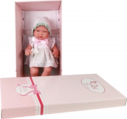 De pop is prachtig gekleed in witte kanten jurkjes met mutsje en wordt geleverd met een kussentje, dekentje en een fopspeen aan een ketting die in het mondje kan worden geplaatst. Geschikt voor rollenspel; stimuleert empathie, fijne motoriek en fantasie.
