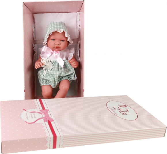 Pablo is gekleed in een stijlvolle groen-witte zomerse mouwloze romper met korte pijpjes, versierd met witte kant, en aangevuld met een strikmutsje. Hij ligt op een zacht kussentje met dekentje en heeft een fopspeen aan een ketting die in het mondje kan worden geplaatst en daar stevig blijft zitten. Fabrikant ASI (Asivil) is een Spaans familiebedrijf met meer dan 50 jaar traditie, dat inzet op 100% lokale ambachtelijke productie en strikte Europese normen.