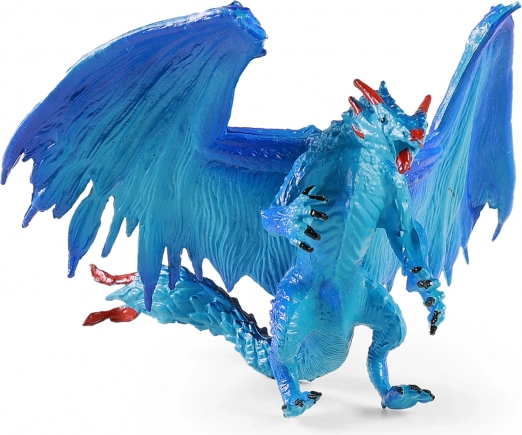 Gedetailleerde blauwe draak met grote uitgespreide vleugels en rode accenten op het gezicht en de staart.