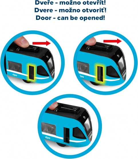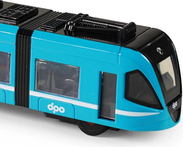 Blauwe moderne tram met een achteruitrijfunctie is een geweldig cadeau voor liefhebbers van openbaar vervoer. Realistisch ontwerp en openende deuren voegen aantrekkingskracht toe aan dit speelgoed.