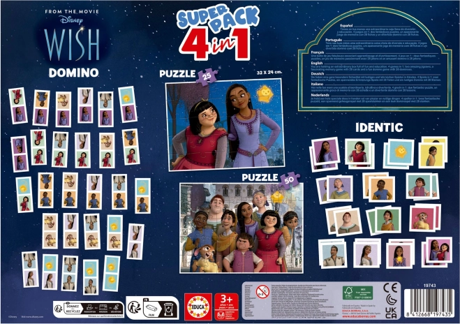 EDUCA Spelenset Wensen 4-in-1 is een ideale keuze voor kinderen die van verschillende spelactiviteiten houden. Dankzij de variatie aan spellen voldoet het aan elke kinderlijke gril en nodigt het uit tot ontdekken en leren.