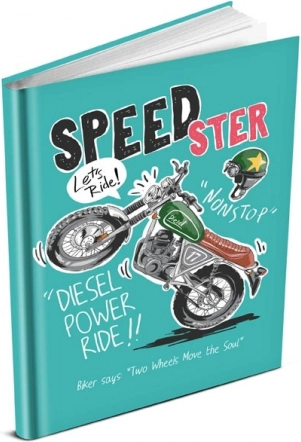 Voor motorliefhebbers is dit herdenkingsboek perfect. De motor op de omslag wordt aangevuld met teksten zoals 'SPEEDSTER' en 'Two Wheels Move the Soul'.