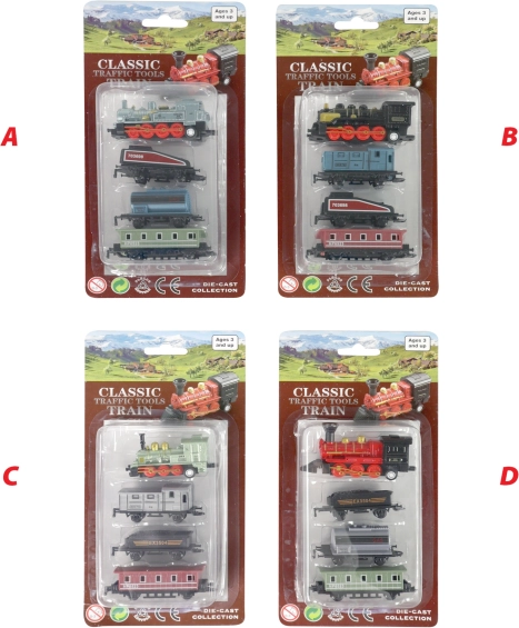 Ontdek het speelplezier met deze mini-treinset, bestaande uit een metalen locomotief en drie plastic wagonnetjes. De locomotief is gemaakt van kwalitatief metaal voor extra duurzaamheid en is ongeveer 7 cm lang. De wagons zijn licht maar robuust, waardoor de set geschikt is voor kinderen vanaf drie jaar. Het product beschikt over een terugtrekmechanisme, waarmee kinderen de locomotief vooruit kunnen laten rijden door hem eenvoudig naar achteren te trekken.