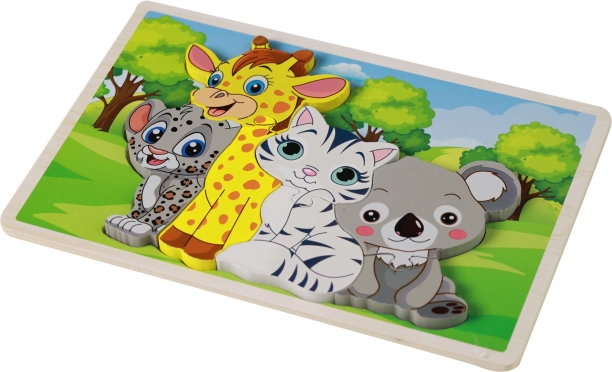 Een schattige houten puzzel met dieren zal elke kleine ontdekkingsreiziger blij maken. Bevat 8 stukjes met vrolijke, felle kleuren en gezellige illustraties die de fijne motoriek en fantasie stimuleren.