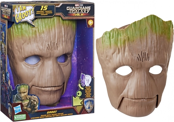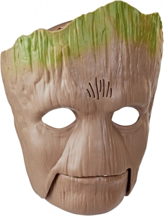 Het masker bootst Groot na met realistische details, inclusief een houten uiterlijk en groene accenten.
