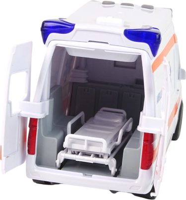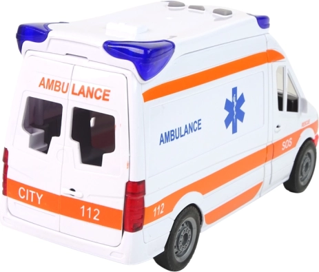 Realistische kinderambulance voor kleine hulpverleners met licht- en geluidseffecten, openende deuren en mechanische frictie-aandrijving. Inclusief uitneembare brancard op wieltjes, rubberen banden en veilig kunststof ontwerp, geschikt voor kinderen vanaf 3 jaar.