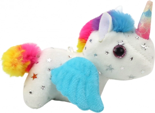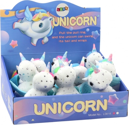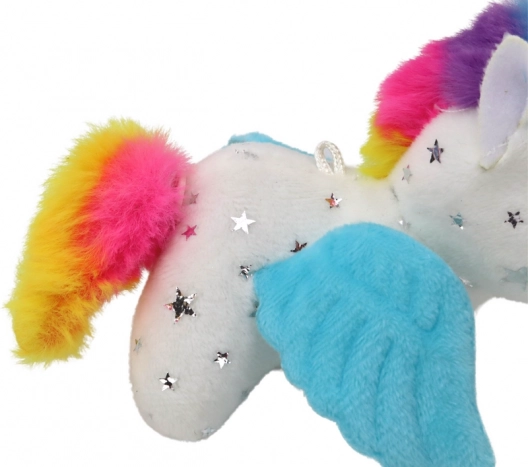 Stap binnen in een magische wereld met deze pluchen eenhoorn waar kinderen bij de eerste aanraking verliefd op worden. De zachte witte vacht met zilveren sterretjes, de kleurrijke manen en staart en de schattige blauwe vleugeltjes geven het speelgoed een unieke charme. Na het opwinden van het koord begint de eenhoorn springend te bewegen en met haar staart te kwispelen, zodat het plezier nooit ophoudt.