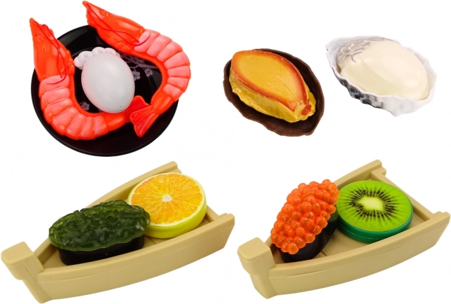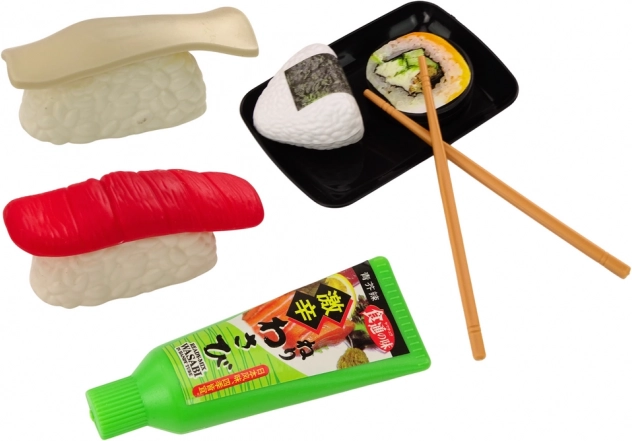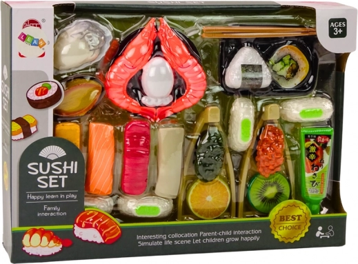 Een speelgoedset voor kinderen die de kleintjes meeneemt naar de magische wereld van het bereiden en serveren van heerlijk sushi. De set bevat diverse ingrediënten die nodig zijn om smakelijke sushi te maken. Tot de ingrediënten behoren garnalen, zalm, wasabi, rijst, nori-zeewier en sushi-eetstokjes.