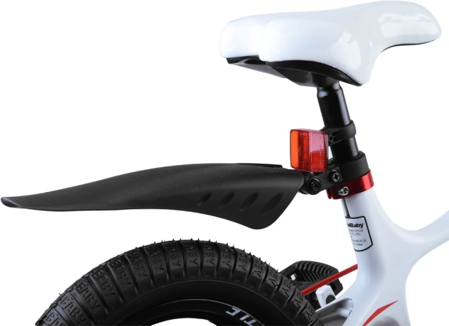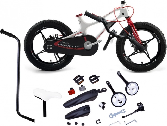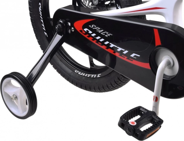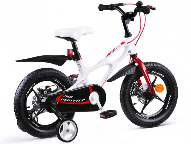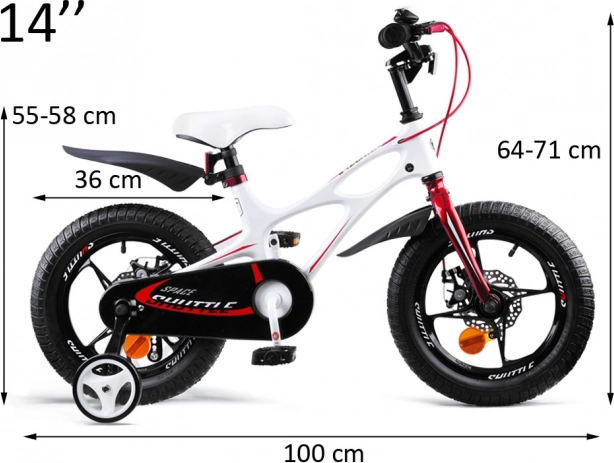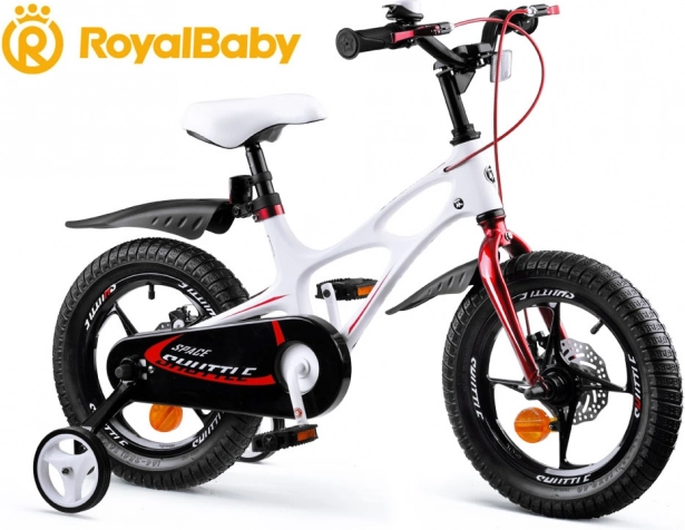 De RoyalBaby Space Shuttle 14" is de eerste kwaliteitsfiets voor jonge rijders. Het ultralichte magnesium frame met vloeiende lijnen maakt het sturen gemakkelijk, terwijl de brede 2,4" banden en stabilisatoren zekerheid bieden tijdens de eerste ritten. Dubbele schijfremmen voor en achter zorgen voor betrouwbaar en soepel remmen.