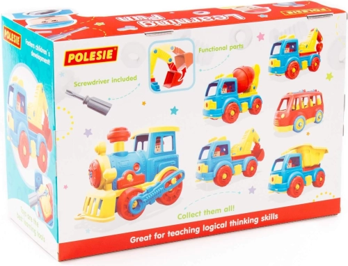 In de verpakking zitten een kunststof schroevendraaier en een bouwvakkersfiguur die in de ruime cabine kan worden geplaatst. Het speelgoed is gemaakt van duurzaam plastic en voldoet aan de CE- en EN71-normen.
