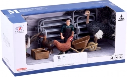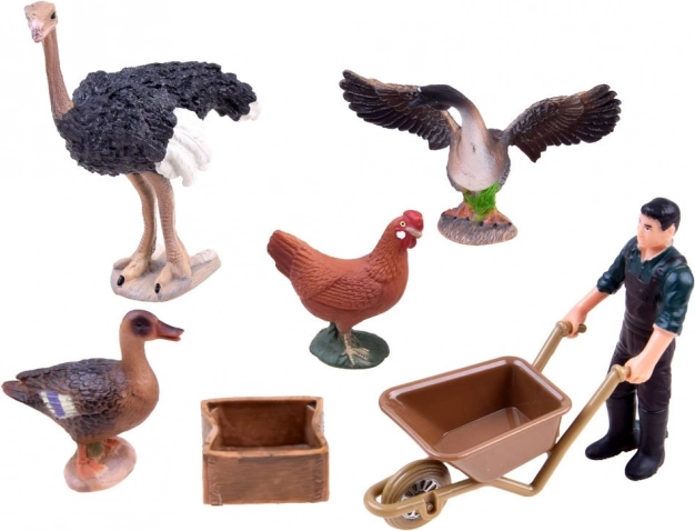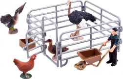 - struisvogel, kip, gans, eend, boer met kruiwagen, omheining en accessoires