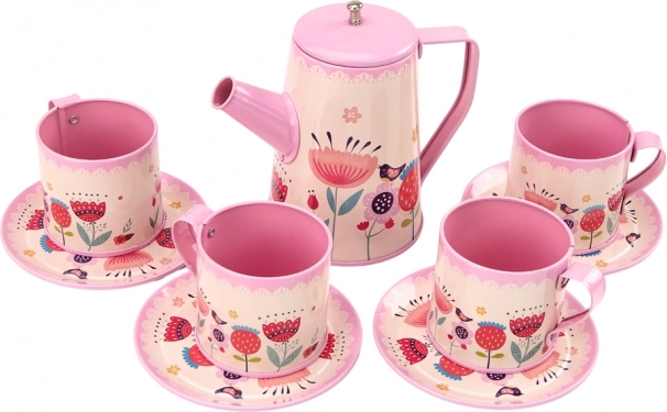Schattig metalen theeservies voor kinderen in het roze, perfect voor kleine gastvrouwen en gastheren. Bevat alles voor een spelletje café: dienblad, theepot, kopjes en bordjes. Dankzij het stevige materiaal is de set duurzaam en veilig voor kinderen vanaf 3 jaar. Kleurrijke bloemenmotieven en praktische details maken van elk spel een vrolijke en realistische ervaring die de fantasie en sociale vaardigheden stimuleert.