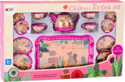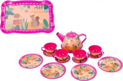 Deze betoverende koffie- en theeset zal alle kleine gastheer(tjes) blij maken. In de set vind je een elegant dienblad om te serveren, een theepot voor thee of koffie, 4 kopjes met schoteltjes en 4 dessertbordjes. Alles is uitgevoerd in roze en versierd met bosdierenmotieven, wat het spel een bijzondere charme geeft.