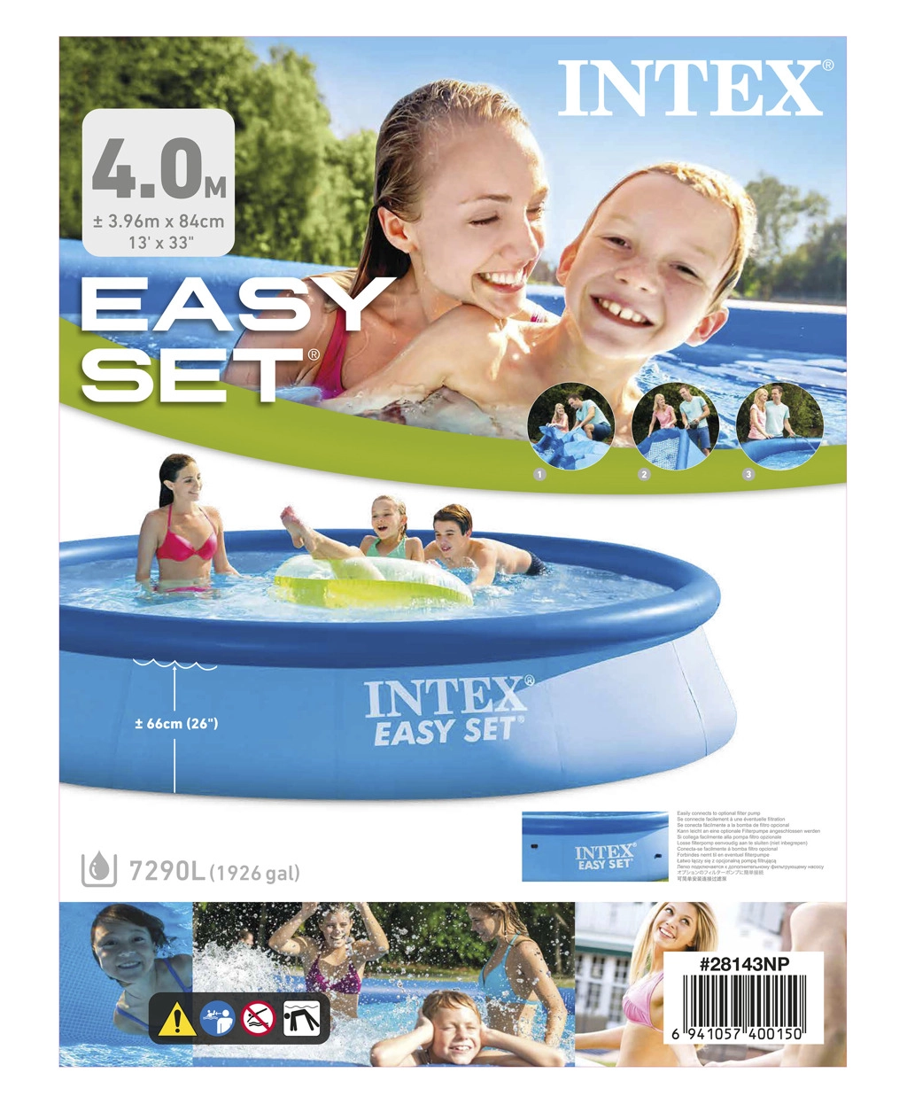 De diameter van 396 cm en hoogte van 84 cm bieden voldoende ruimte voor kinderen en volwassenen. Ideaal voor zomers speelplezier en ontspanning in het water.