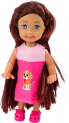 De kleine pop met drie hondjes in een nestje is een schattig en compact speelgoed, ideaal voor meisjes die van poppen en dieren houden. De pop draagt een kleurrijke, zorgvuldig afgewerkte jurk en haar lange bruine haar kan gekamd en gestyled worden naar wens. Ze wordt vergezeld door drie kleine hondjes in een mandje, die het spel nog leuker maken.
