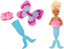 De mini pop zeemeermin met feeënstaart 2-in-1 is een schattige speelgoedset die kinderen veel speelplezier en creatieve speelmogelijkheden biedt. Deze kleine pop heeft krullend blond haar in een paardenstaart, wat haar extra charme geeft.