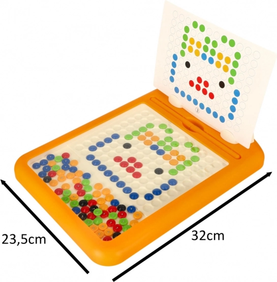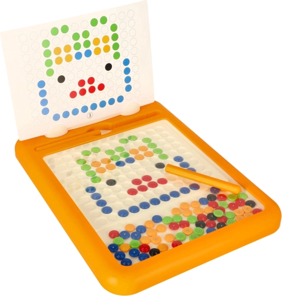 Dankzij de magnetische pen verplaatsen kinderen moeiteloos de gekleurde knopjes en maken ze afbeeldingen naar eigen fantasie of met behulp van sjablonen. Plezier zonder rommel en met direct resultaat.