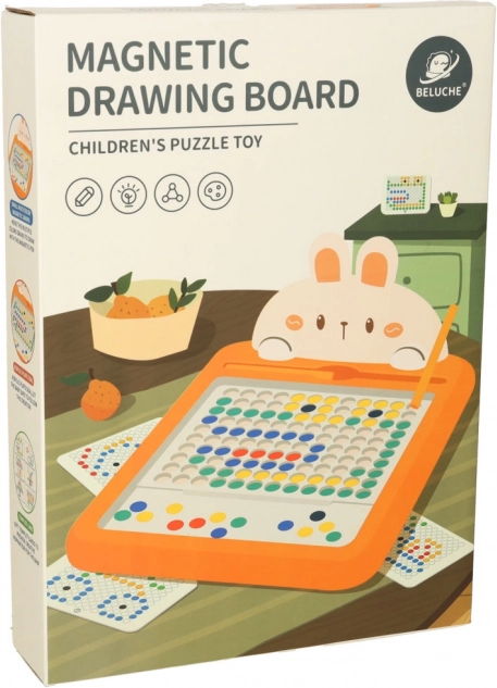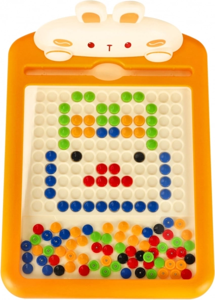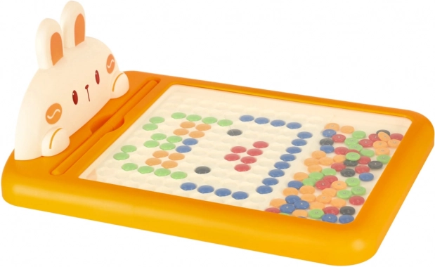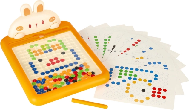 Dit magnetische mozaïekbord bevat kleurrijke magnetische knopjes die het kind met een magnetische pen verplaatst om allerlei patronen en afbeeldingen te creëren. Inclusief sjablonen voor een vlotte start en onbeperkt eigen ontwerp. Het schattige konijntje aan de bovenkant van het frame geeft het spel een vriendelijke uitstraling.