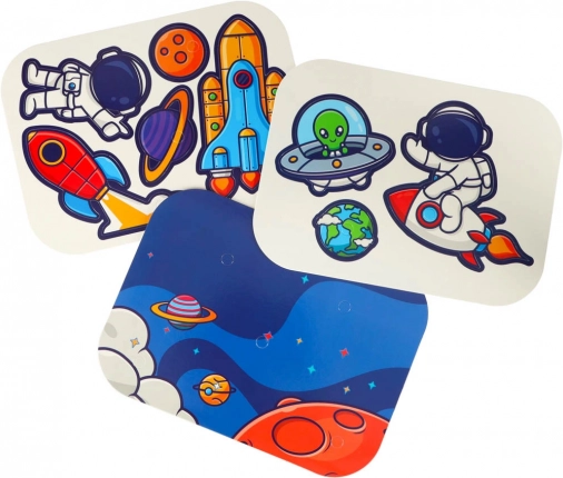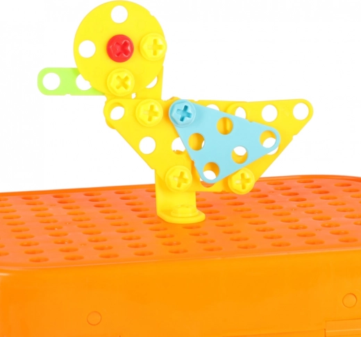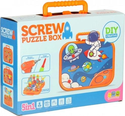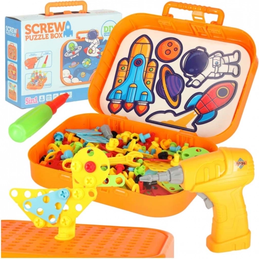 Ontdek een leuke en educatieve speelgoedset voor kleine bouwers: een draagbare mozaïek met elektrische boormachine en schroeven. Kinderen oefenen hun fijne motoriek, creativiteit en logisch denken bij het bouwen van 2D- en 3D-modellen met kosmische motieven. De compacte oranje koffer dient als opbergruimte én speelvlak, ideaal voor onderweg.