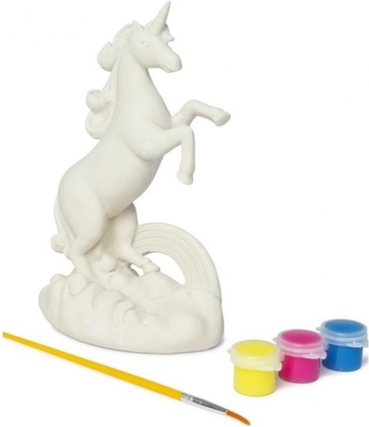 Creatieve set voor het maken van een tuindecoratie in de vorm van een eenhoorn, bevat een figuur, verf en penselen. De eenhoorn is ontworpen met een mat oppervlak zodat verf gemakkelijk hecht en is stevig genoeg om weersomstandigheden te weerstaan.