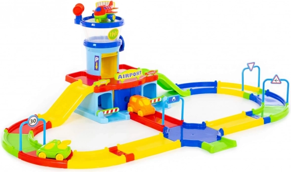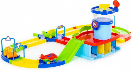 Het systeem van meerkleurige trajecten met bruggen, tunnels en aansluitingen voor voertuigen en vliegtuigen zorgt voor een soepele rit en talloze speelscenario’s.
