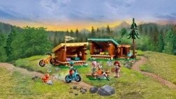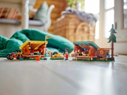 De LEGO Friends set Vriendelijke huisjes op het zomerkamp bevat twee bouwbare blokhutten, een kampvuur en rollenspelaccessoires.