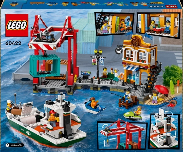 LEGO City zeehaven met vrachtschip 60422: functionele kraan, schip, winkel, restaurant, strand en 8 minifiguren. 1226 onderdelen voor kinderen vanaf 8 jaar.