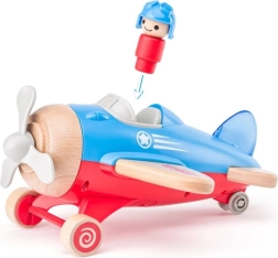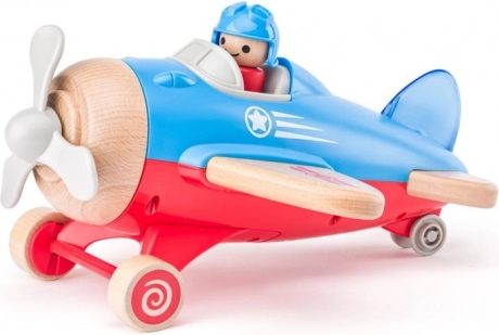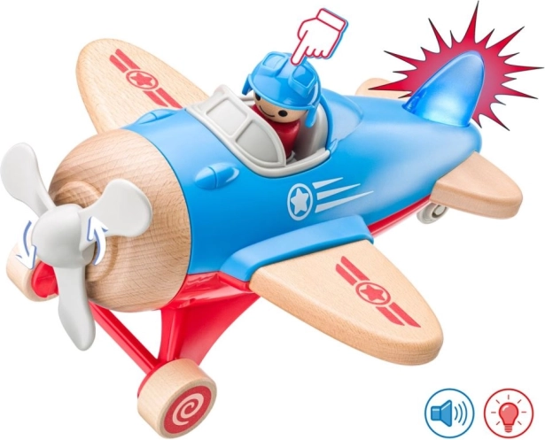 Het vliegtuig is uitgerust met een draaiende propeller en een kleine pilotenfiguur, wat uitnodigt tot interactieve spel.