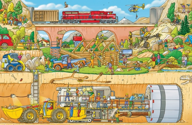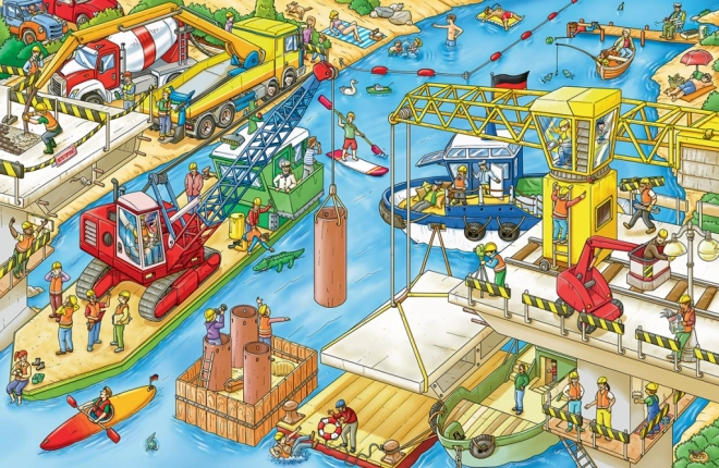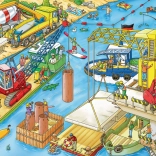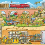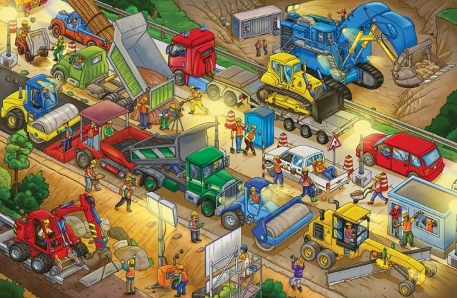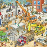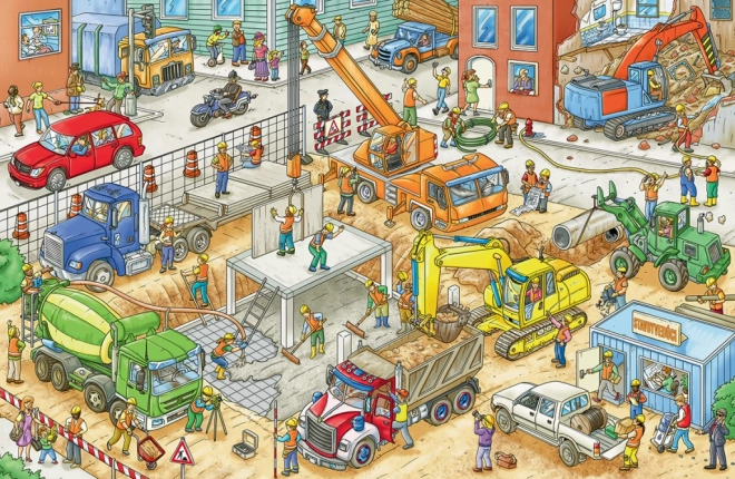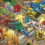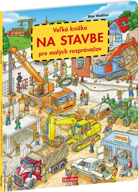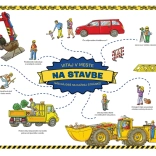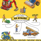 Het boek bevat illustratieve scènes die een levendige bouwplaatsomgeving weergeven met verschillende bouwmachines.