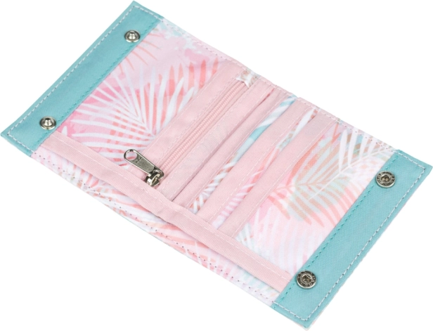 Het design met pastelgekleurde palmbladeren geeft de portemonnee een frisse uitstraling en past gemakkelijk bij je rugzak of handtas. De compacte afmetingen passen comfortabel in je zak en het ritsvakje voor kleingeld maakt snel betalen en het organiseren van munten eenvoudig.
