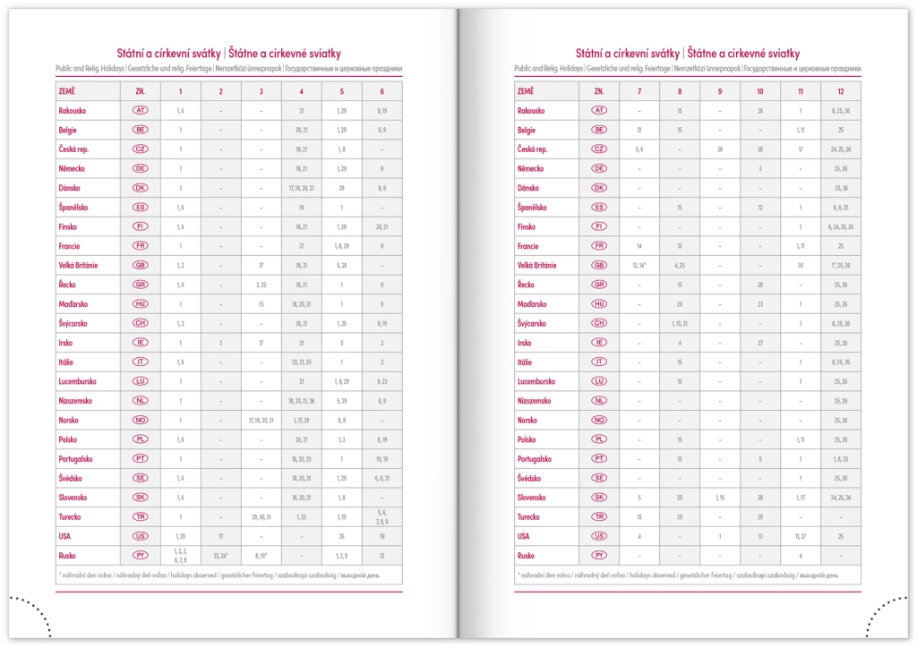 De praktische indeling met een wekelijks overzicht en een Tsjechisch‑Slowaakse kalender, aangevuld met Engels, Duits, Hongaars en Russisch, zorgt voor perfect overzicht. Ook aanwezig: maand- en jaarplanningskalenders, ruimte voor notities, evenals handige kaarten en een namenlijst.