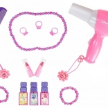 Kinderen kunnen spelen met een föhn, kam, parfumflesjes, kralen, armbanden, ringetjes en veel meer accessoires.