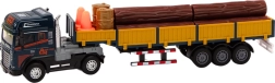 Realistisch model van een vrachtwagen in schaal 1:24 met een blauwe cabine, een afkoppelbare oplegger met afneembare zijschotten en lading in de vorm van houten boomstammen. Voor nog meer speelplezier beschikt hij over licht- en geluideffecten (motorstart, achteruitrijden) en vrijloop/trekmechanisme voor het rijden. Inclusief verplaatsbare pylonen en twee vaten voor laad- en “werkterrein”-scenario’s. Met CE-certificering, conform EN71, geschikt vanaf 3 jaar.